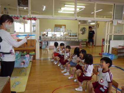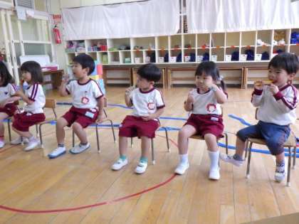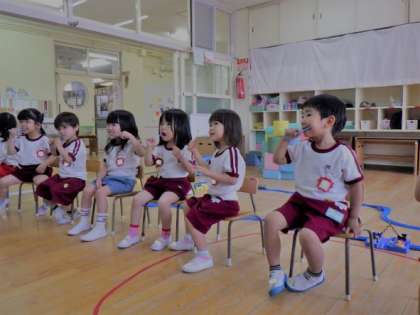 3歳児が歯磨きをしました。養護教諭が歯の模型を使用し、楽しい音楽に合わせて磨き方を指導しました。大きな歯を見て、真似をしながら磨いていました。歯の大切さを知らせることで、自分から進んで歯を磨くことができるようにしていきたいと思います。