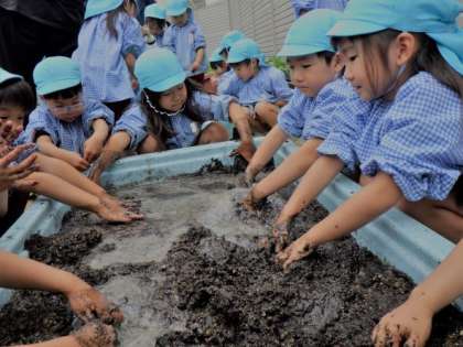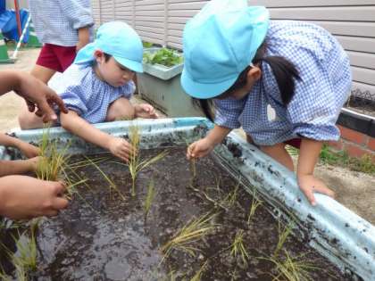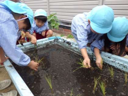 5歳児がイネを植えました。「イネってなあに?」から始まりイネの本を読み、毎日お弁当で食べているお米とつながったようです。田んぼを見たことがない子どもたちも多いので、土づくりから一緒にしました。なかなかできない自然体験を通して、成長や収穫の喜びを感じることができるようにしていきたいと思います。お子さんと一緒に見てください。