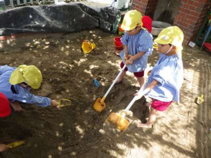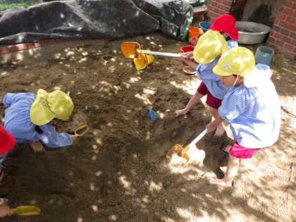 子どもたちが「温泉に水入れたい!」と砂場で遊んでいました。でも温泉をつくるには砂場に穴を掘らないとできません。スコップで穴を掘るのはなかなか難しいです。「スコップに砂を乗せて、穴の外にポイっと出すんだよ」と一緒にやっているうちに、自分たちで穴が掘れるようになり、大きな温泉ができました。子どもたちは知らないことも、大人が一緒に遊んだり知らせたりすることで、たくさんのことを吸収しています!