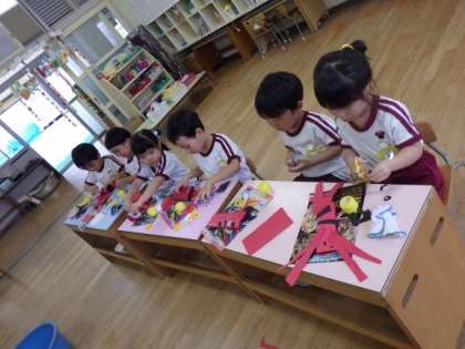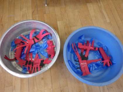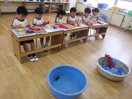 4歳児ほし組でザリガニをつくりました。飼育しているザリガニを保育室に置いておくと「ハサミ上にあげてるで!」「目が黒いな」「足がいっぱいや」子どもたちはザリガニのいろいろなことに気付いていました。つくりながら「このハサミは強いねん」「触覚こんなんやな」などザリガニを思い浮かべて、自分のザリガニをつくることを楽しんでいました。最後はたらいに入れて、ザリガニたちが仲良く遊んでいました。いろいろな生き物に興味や親しみを感じてほしいと思っています。