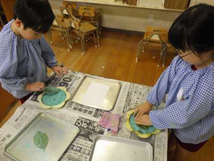5歳児が園庭にある葉を使って遊びました。「葉っぱはんこやな」と言い何度も繰り返し楽しんでいました。大きな紙には、葉をつなげて笹のように表現する子どももいました。身近にある自然物を遊びに取り入れることで、自然への興味を高めていきたいと思います。