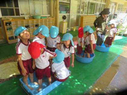 今日も、朝一番からテラスで水遊び!水や氷を触って涼しく遊んでいても熱中症対策は欠かせません。水遊びの合間に冷え冷えタイム!お茶を飲み、保冷材で体を冷やす時間を設けています。足を水につけて「気持ちい〜!」と子ども達は大喜び。まだまだ厳しい暑さが続きますが、熱中症対策をしっかりしながら夏休みの預かり保育をしていきたいと思います。