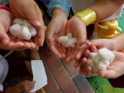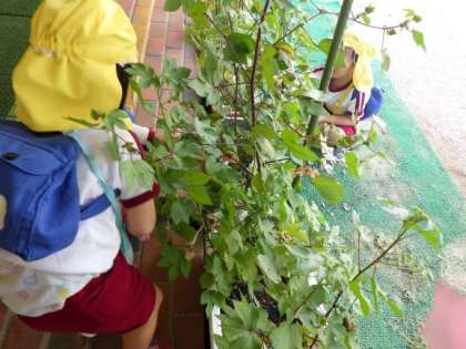 ワタの種を蒔いたら、ワタができたよ! 公開日 2024/09/10 更新日 2024/09/10 保育の様子 4歳児ほし組が1学期にワタの種を蒔きました。芽が出てぐんぐん大きくなりました。そして最近、フワフワのワタができているのを発見しました。そのワタをそーっと子どもたちと採りました。フワフワのワタの中には種が入っています。その種を蒔くと・・ 自然の不思議さを子どもたちは毎日体験しています。 いいね(0)