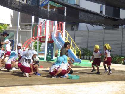 運動会後も5歳児がリレーごっこを楽しんでいます。今日は4歳児も一緒に走ることを楽しみました。「がんばれー」と互いに応援しながら走る姿はとても楽しそうでした。終了後は「一緒に走ってうれしかった」と話していました。異年齢での交流がもちやすい環境を活かした保育を大切にしていきたいです。