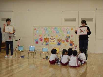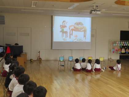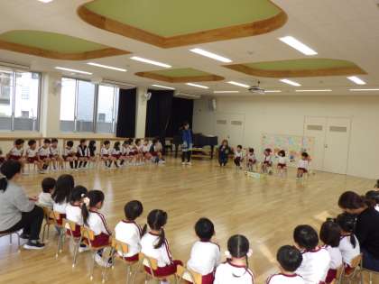 11月の誕生会をしました。11月生まれの子どもたちはそれぞれが選んだ入場や自己紹介を頑張っていました。見ている子どもたちは「おめでとう」と言ったり拍手を贈ったり心を込めてお祝いしていました。動物の鳴き声クイズをしたり『もりのきのみ』の絵本を見たりして楽しい誕生会になりました。誰にでもある誕生日を一人一人が自分は大切な存在だと感じられるような誕生会をこれからも考えていきたいと思います。