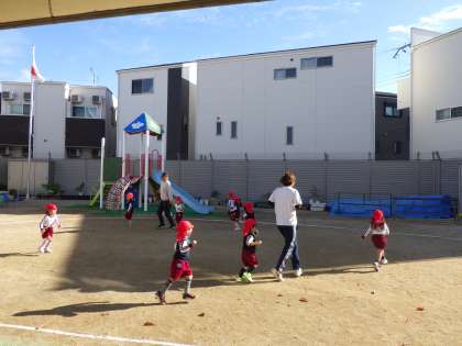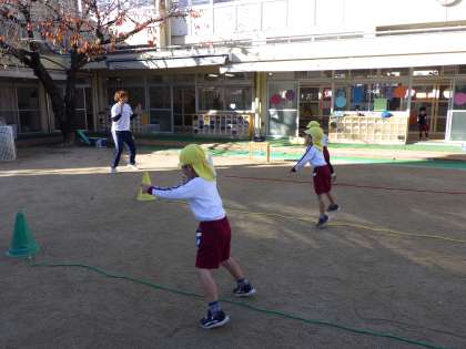 今日はのび×のびタイムがありました。子どもたちは、簡単なルールのある追いかけっこ、ボールや縄を使った遊びを教えていただき、園庭で体を動かして遊ぶことを楽しみました。季節も冬へと変わり、寒い日が続きます。これからもいろいろな体を動かす遊びを通して、風邪にも負けない体力づくりをしていこうと思います。