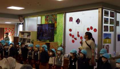5歳児が地域のおじいさん、おばあさんに会いに行きました。「可愛いね」と頭を撫でていただき、拍手で迎えていただきました。手遊びを一緒にしたり、手を握ったりしながら、うれしい時間を過ごすことができました。帰り道ではナンテンを見つけ「これ幼稚園にもあるな」と地域の自然にも興味をもっています。。地域の皆さんとの交流の機会を通して、たくさんの方とのかかわりを大切にするとともに、地域を知る機会につなげていきたいとおもいます。