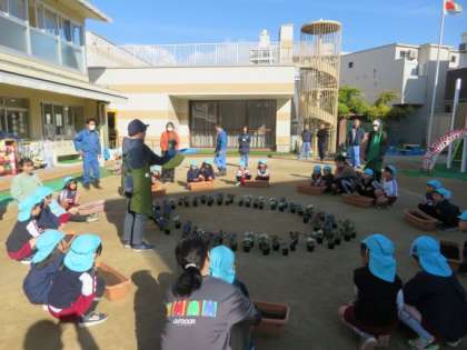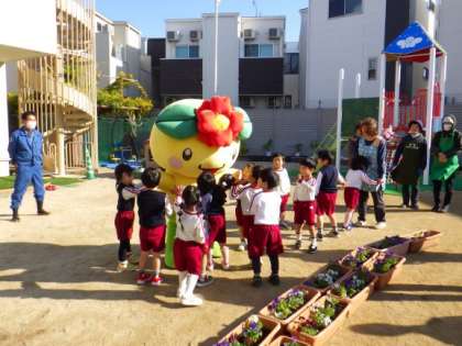素敵なお花を見に西淀川区のマスコットキャラクターのにーよんも遊びに来てくれました。はな組とほし組も一緒にお花を見たりにーよんと写真を撮り触れ合ったりしました。今後も地域の方々との関わりを通して親しみや感謝の気持ちをもち、過ごせるようにしたいと思います。