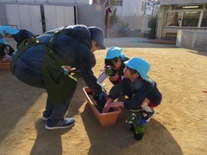 西淀川区役所の方と地域のボランティアの方がそら組にお花のことやお花の植え方を教えに来てくださいました。優しく苗を取り出すことやお水は土にやること、大切に育てるととても大きく育つことなど丁寧に教えていただきました。ビオラとハボタンの苗を自分たちで2つ選んで植えました。地域の方が大切に育てた苗をこれからは子どもたちが幼稚園で大切に育てていく約束もしました。