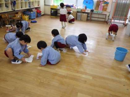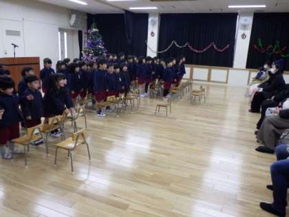12月23日(月)に2学期の終業式がありました。子どもたちは各クラス2学期に使った保育室を掃除したり、片付けたりしました。気持ちよく3学期が迎えられそうです。終業式では冬休みの約束のお話を聞いたり、歌を歌ったりしました。