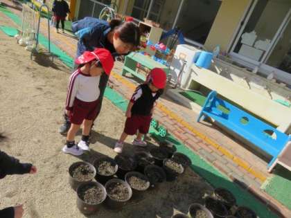 チューリップの芽がでてきたかな? 先生と一緒に探して、発見していました。