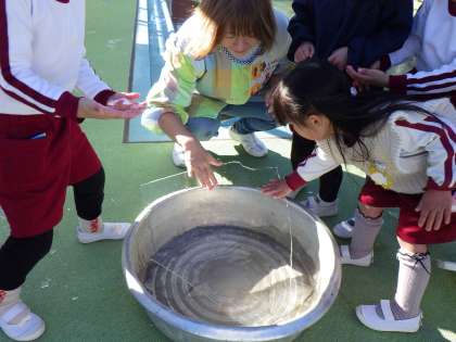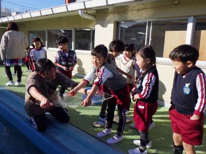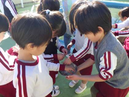 今朝は朝から冷え込んでいました。前日に容器に水を貯めて帰っていた5歳児が「プールが氷になってる」と教えてくれました。気温が下がったことで、分厚い氷ができていて子どもたちは大喜びでした。「冷たいなあ」と言いながら氷を触ったり、透かして見たりして楽しみました。タイミングを逃さず、自然現象の不思議さや感動を子どもたちを一緒に感じていくことができるようにしていきたいと思います。