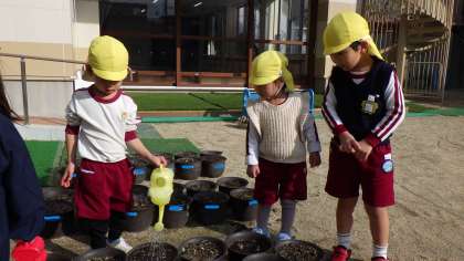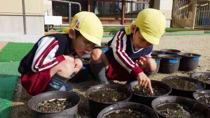 出てきたよ 公開日 2025/01/20 更新日 2025/01/20 保育の様子 4歳児は毎日水やりをしています。「これ見て!出てきた」と言って球根の芽を教えてくれました。「ここも出てる」と友達の芽も見つけてうれしそうでした。「何色咲くかわからんねんなあ」と花が咲くのを楽しみにしています。季節を感じながら身近な自然に関心をもつ機会を大事にしていきたいと思います。 いいね(0)