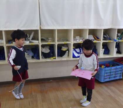 昨日の誕生会で5歳児の誕生児がこまを回したこまを下敷きに乗せる技を見せてくれました。それを見ていた4歳児の子どもたちは「下敷きほしいねん」と早速挑戦する気一杯です。5歳児のクラスから下敷きを借りて来て挑戦した子どもたち。最初はうまく乗せることができません。でも何度もあきらめずこまを回し続けると・・できた!!!とても嬉しそうな子どもたちでした。4歳児は5歳児に憧れの気持ちをもち、刺激を受け真似したいと思います。異年齢での関わりを大切にしていきたいです。