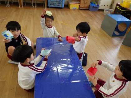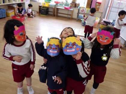 4歳児ほし組が節分の豆を入れる箱を折りました。今年は2月2日が節分です。節分はみんなが健康で幸せに過ごせますようにという意味をこめて、悪いものを追い出す日です。「鬼は外、福はうち」と言いながら豆をまいて邪気祓いをします。豆の箱を折った後は、月間絵本に付いていた鬼のお面をかぶって遊びました。ほし組の鬼たちは、良い鬼だそうです。