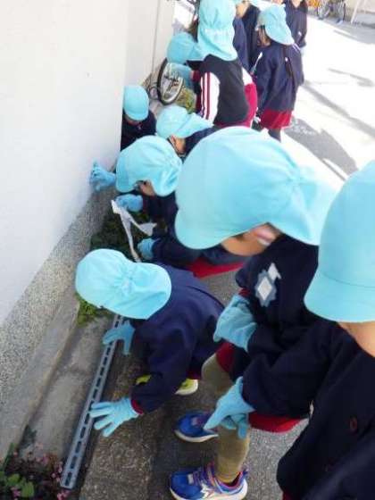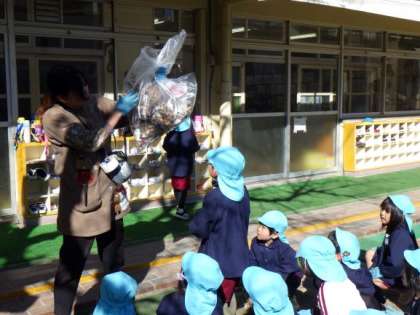 大阪市の事業の一環であるクリーンアップ作戦に参加しました。5歳児は幼稚園の周りを、3歳児4歳児は園庭を掃除しました。いつも何気なく通っている道の隅をよく見て見ると枯葉やビニール、吸い殻などが落ちていました。園庭では落ち葉や石を拾ってみんなが気持ちよく遊べるようにしました。みんなで拾ってきれいになると「気持ちよくなった」と感じている様子でした。みんなが気持ちよく過ごすためにはポイ捨てをしないなど一人一人の意識が大切であることを今日の経験を通して子どもたちは感じたと思います。