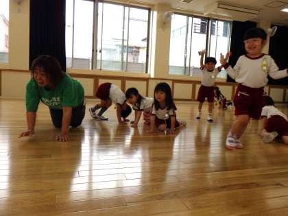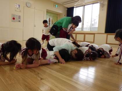 4歳児がダンゴムシになって遊びました。体を丸めたり、足をバタバタさせたりしています。身近にいるダンゴムシを普段から見ていることで、特徴を捉えながら表現することを楽しんでいました。子どもたちの感性を大切にしながら、表現遊びの楽しさを伝えていきたいと思います。