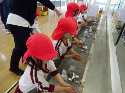はな組にも手洗いの保健指導をしました。目には見えないけど、手にバイキンが付いていることがわかると「バイキンさん食べるとお腹が痛くなる」「あわあわしないと」と話していました。6つのバイキンをやっつけるために、歌に合わせて手洗いをすると、ピカピカの手になりました。これからも丁寧に手洗いをし、元気に過ごしたいと思います。