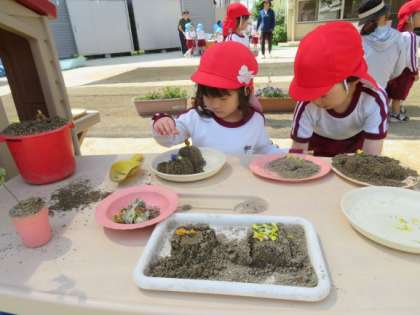 3歳児は砂でつくったごちそうに草花を飾っています。