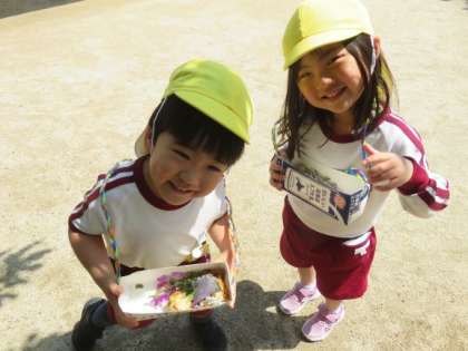 姫島幼稚園では、好きな遊びの時間の中で特に自然とふれあって遊ぶことをねらいとした「わくわくタイム」を行っています。今年度初めてのわくわくタイムでは、春の草花や昆虫を探したり、草花を使って遊んだりする姿が多く見られました。