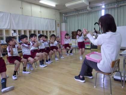 今日は年長児が視力検査をしました。視力検査ではランドルト観(Cみたいなもの)をドーナツに見立て、アライグマのぬいぐるみがドーナツのどこを食べたかな?とクイズ形式にしています。「右を食べてるよ」と話しながら、指を右に向けて教えてくれました。