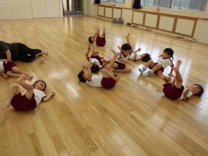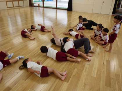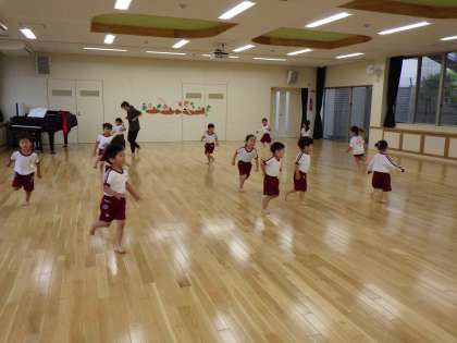4歳児は遊戯室で走ったり、大好きなダンゴムシになったりして遊びました。日々ダンゴムシの世話もしているので、動きもよく知っています。雨の日は体を動かして遊ぶことが少なくなりがちですが、施設を活用して過ごすようにしていきたいと考えています。