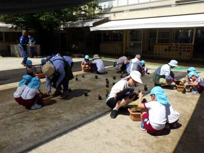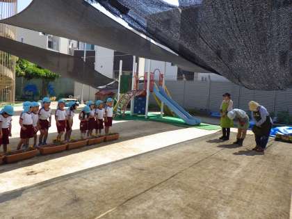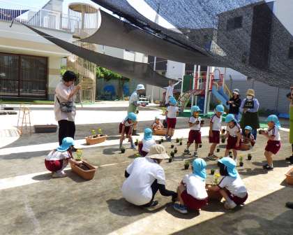 5歳児が西淀川区のお花のボランティアの皆様に花苗の植え方や、水やりの仕方を教えていただきました。「マリーゴールドっていうのよ」と花の名前も教えていただき、より花に親しむ機会となりました。幼稚園でも種、苗、球根など意図的に様々なものに触れる機会を大切に取り組んでいます。花の美しさを感じてくれると嬉しいです。