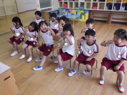 はな組は、6月からお弁当後に歯みがきを始めました。幼稚園では、顎模型のはーこちゃんと一緒に音楽に合わせて歯みがきをします。みんなで「歯みがき列車、出発進行!」と歯ブラシを列車に見立てて楽しくみがいています。歯の大切さを知り、自分で磨けるように継続していきたいと思います。