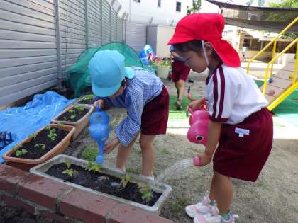 フウセンカズラが大きくなってきたので、5歳児と3歳児がプランターに植え替えました。「土のお布団かぶせてあげるよ」と5歳児が3歳児に教えながら植え替える姿を見て、心があたたかくなりました。してもらった経験や、やさしさが繋がっていることを実感します。異年齢交流を継続し、やさしさのバトンが繋がるようにしていきたいと思います。