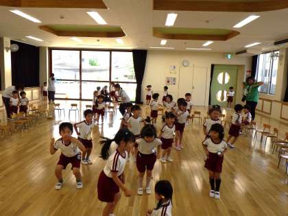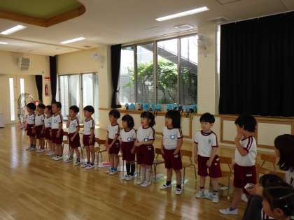 7月生まれの誕生会をしました。5歳児は司会をすることで、自分の役割に責任をもって行う姿があり、夏みつけ遊びでは、みんなで応援しながらお祝いをすることができました。誕生会を通して、一人一人が大切にされていることを感じることができるように取り組んでいきたいと思います。