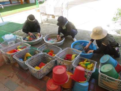 早いもので、1学期が終わります。教職員で砂場やプールの道具の片付けをしました。預かり保育に参加している子どもたちも手伝ってくれましたよ。2学期も子どもたちが気持ち良く過ごせるように、夏休みに安全点検や園内の整備を行い、保育環境を整えておきたいと思います。