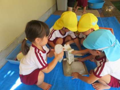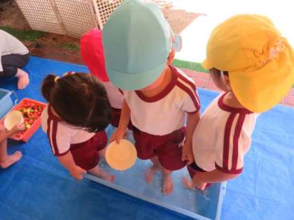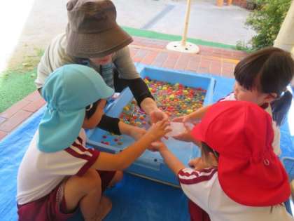 今日から夏休みが始まりました。預かり保育に参加した子ども達は、登園してすぐに水遊びをしました。水鉄砲やスーパーボールすくいをして遊んだり、氷を触って「つめた〜い!」「ツルツルしてる!」と言いながら感触を楽しんだりしました。まだまだ厳しい暑さが続きますが、暑さ対策をしながら楽しい夏休みの預かり保育にしていきたいと思います。。