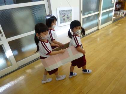 電車に乗って他のクラスの友達や、金魚に会いに出かけました。電車のスピードを考え、友達と気持ちを合わせて電車に乗る姿を見ると、あたたかい気持ちになりますね。雨の日も楽しく活動できるよう工夫していきたいです。
