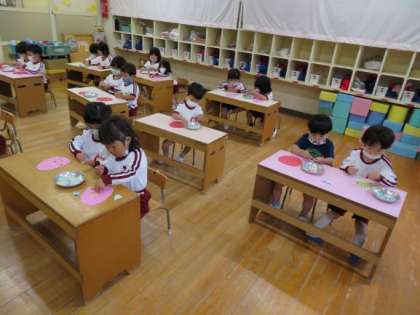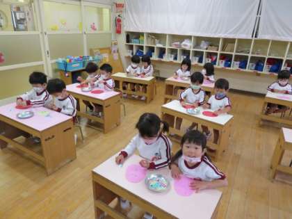 はな組でイチゴのツブツブ(イチゴの種)をシールで貼りました。指先を上手に使い、真剣な表情で、いろいろな色のシールをたくさん貼って、おいしそうなイチゴができました。保育室の壁面に貼っています。