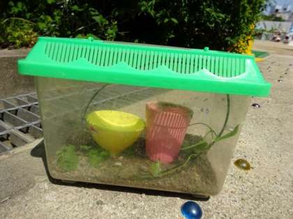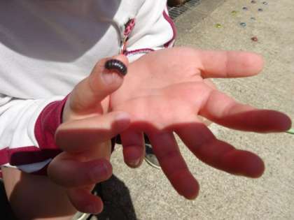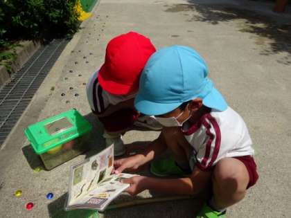 ダンゴムシ探しを楽しんでいます。5歳児が3歳児に「ダンゴムシもごはん食べるから葉っぱ入れてあげよう」と教えてくれました。3歳児は、ままごとの茶碗とコップを持ってきて虫かごに入れると「ごはんおいしい?」と言っていました。3歳児のなんとも可愛い表現です。見ていた5歳児は「えっ…」と固まっていましたが、3歳児の思いに寄り添い、そっと葉っぱを入れてくれました。あたたかい気持ちになりますね。