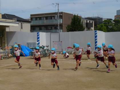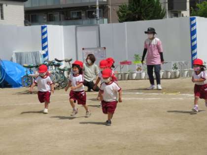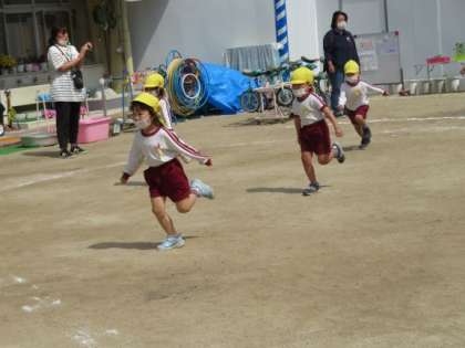 心地よい季節の中、全園児でかけっこをしました。走る楽しさや、友達を応援する喜びを感じられるよう、繰り返し遊んでいきたいと思います。