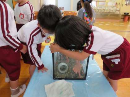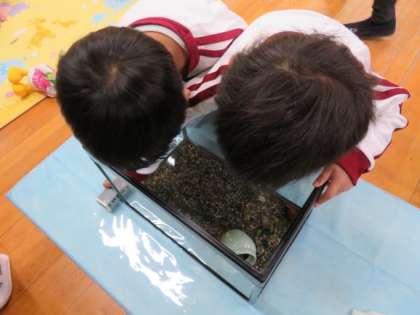 初めは恐る恐る水槽に指を入れては引っ込ませていた子どもたち。少しずつサワカニと仲良くなって、指先で触れられるようになりましたよ。一緒に見たり、餌をあげたりしながら大切に飼育して、身近な自然に触れる機会をつくっていきたいと思っています。