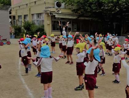 朝から全園児で集会をしました。音楽に合わせて歩いたり、踊ったりして楽しそうでした。幼稚園では年間を通して体を動かして楽しむことができるよう、全園児共通のダンスや遊びを考えて取り組んでいます。