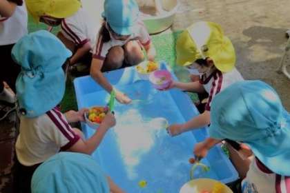 天気も良く日差しも暑かったので、スーパーボールで遊ぶことにしました。水にふれると「気持ちいい」と喜んでいました。5歳児に遊び方を教えてもらいながら3、4歳児も遊ぶことができました。気温に応じて、水遊びも保育に取り入れながら遊びを展開していきたいと考えています。