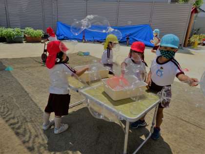 昨日に続きとても良い天気の中、子どもたちは「見て。大きいのできた!」とシャボン玉遊びを楽しんでいました。何を使って楽しんでいるのかわかりますか?