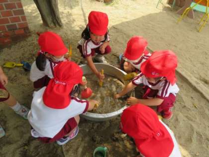 3歳児はな組の子どもたちは、タライの周りに座って、水の中にみんなで砂を入れています。スコップで混ぜながら、時々手を入れて、「冷たいね」と言ったり、泥んこを触って気持ちよさそうにしたりして感触を楽しみながら遊んでいます。