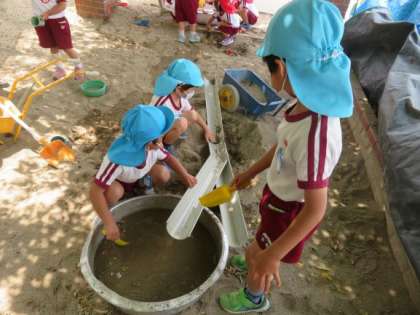 5歳児そら組の子どもたちは、樋を持って来て、どうつなげたらうまく水が流れるか友達と相談しながら、いろいろ繰り返し試して遊んでいます。同じ遊びの場でも、年齢によって楽しみ方、興味、関心のもちかたが違います。これからも子どもたちが楽しめる遊びの場を考えていきたいと思っています。