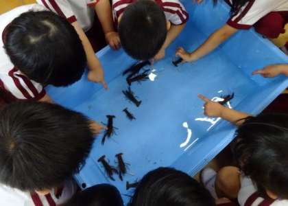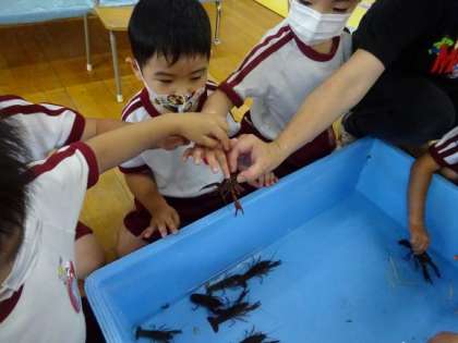 サワガニに続き、ザリガニも幼稚園の仲間入りをしました。最初「怖い」と言う子どももいましたが、友達が触るのを見ることで興味をもち、ゆっくり背中をなでながら「仲良くなれた」と嬉しそうにしていました。身近な生き物に親しみがもてるような環境を大切にしていきたいです。