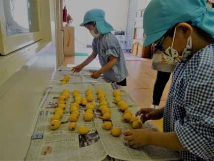 3歳児の保育室から大きなビワの木が見えます。お弁当の時にいつも「ビワとりたい」と色づいてくる様子を楽しみにしながら食べていたことを知り、5歳児が収穫することにしました。収穫後はビワを1.2…と数えながら丁寧に置いていき、全部で220個もありました。3歳児、4歳児も触りながら「なんかほわほわ」と感触を楽しんでいました。ビワを見ることが初めての子どももいました。日々の経験から関心が広がると嬉しいです。