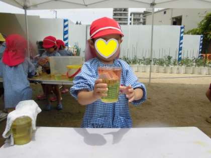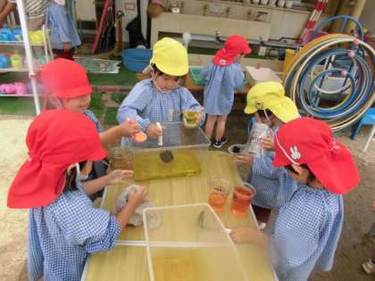 いろいろな色の水をつくって置いておくと「ジュースだー!」と言ってカップやコップに入れて遊んでいます。違う色の水を混ぜると、色が変わることに気付いて、「こんな色に変わった!」と友達や先生に知らせてくれます。今日はなんと、色が2層になっている素敵な色水ができました。子どもたちは、遊びの中でいろいろなことを試し気付きながら遊んでいます。明日はどんな色水ができるかな。楽しみです!