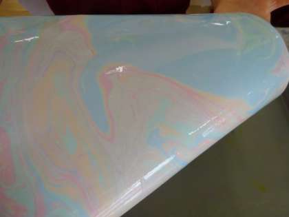 4歳児が「見て!すごいねん」と見せてくれました。これはマーブリングという技法遊びです。好きな色の液を数滴入れて魔法のお箸でひと回ししたあと、紙を浮かべると…こんなにきれいな模様ができるのです。不思議ですよね。様々な活動や経験を通して、豊かな感性や表現を育んでいくことができるようにしたいと思います。