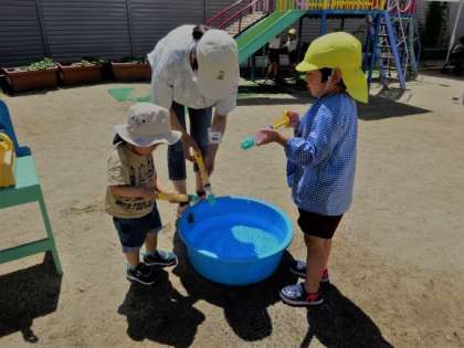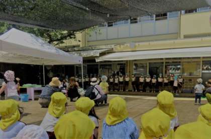 今年度初めてのハッピーランド(未就園児活動)をしました。園庭では4歳児が一緒に遊び、5歳児は歌を披露しました。色水遊びや水鉄砲など、季節の遊びを楽しむ中で4歳児なりに遊び方を見せたり、用具を渡してあげたりしていました。地域の友達に親しみをもち、いろいろな友達と触れ合って遊ぶ楽しさを味わえるように活動を工夫していきたいと思います。次は9月です。是非遊びに来てくださいね。