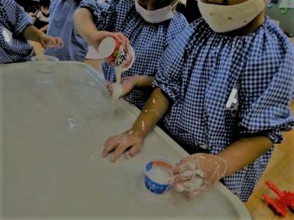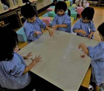 トロトロ気持ちいい! 公開日 2022/06/28 更新日 2022/06/28 保育の様子 3歳児はスライム遊びをしました。「見て〜トロトロ!」と伸びるスライムを見せてくれました。「気持ちいいな」と友達と話しながら、手で触ったり、カップに入れたりしながらスライムの感触を喜んでいました。感触を十分に味わえる素材を用意することで、子どもたちの好奇心を育んでいきたいです。 いいね(0)