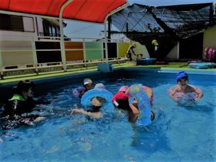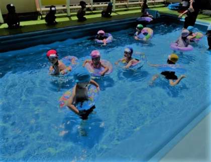 プール楽しい! 公開日 2022/06/30 更新日 2022/06/30 保育の様子 3歳児、4歳児がプール遊びをしました。気温も高く「冷たい」「きもちいいね」と嬉しそうでした。浮き輪で遊んだり、動物になったりして遊びました。プール遊びですが、少しずつ水に慣れてきたように感じます。水の感触を味わいながら、水遊びを全身で楽しめるような活動を取り入れていきたいと思います。 いいね(0)