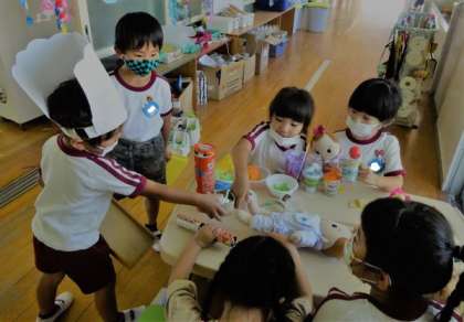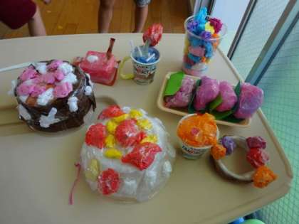 5歳児はお店屋さんごっこをしています。「いらっしゃいませ」「ありがとうございました」など、友達と役割を決めて楽しんでいます。食べ物も種類が増えてきています。自分たちの生活の中にあるものをつくっていました。ご自宅から持参していただいた素材が、子どもたちの手の中でこんなに素敵なものにかわるのですね。来週からのお店屋さんごっこが楽しみですね。素材集めのご協力もありがとうございます。